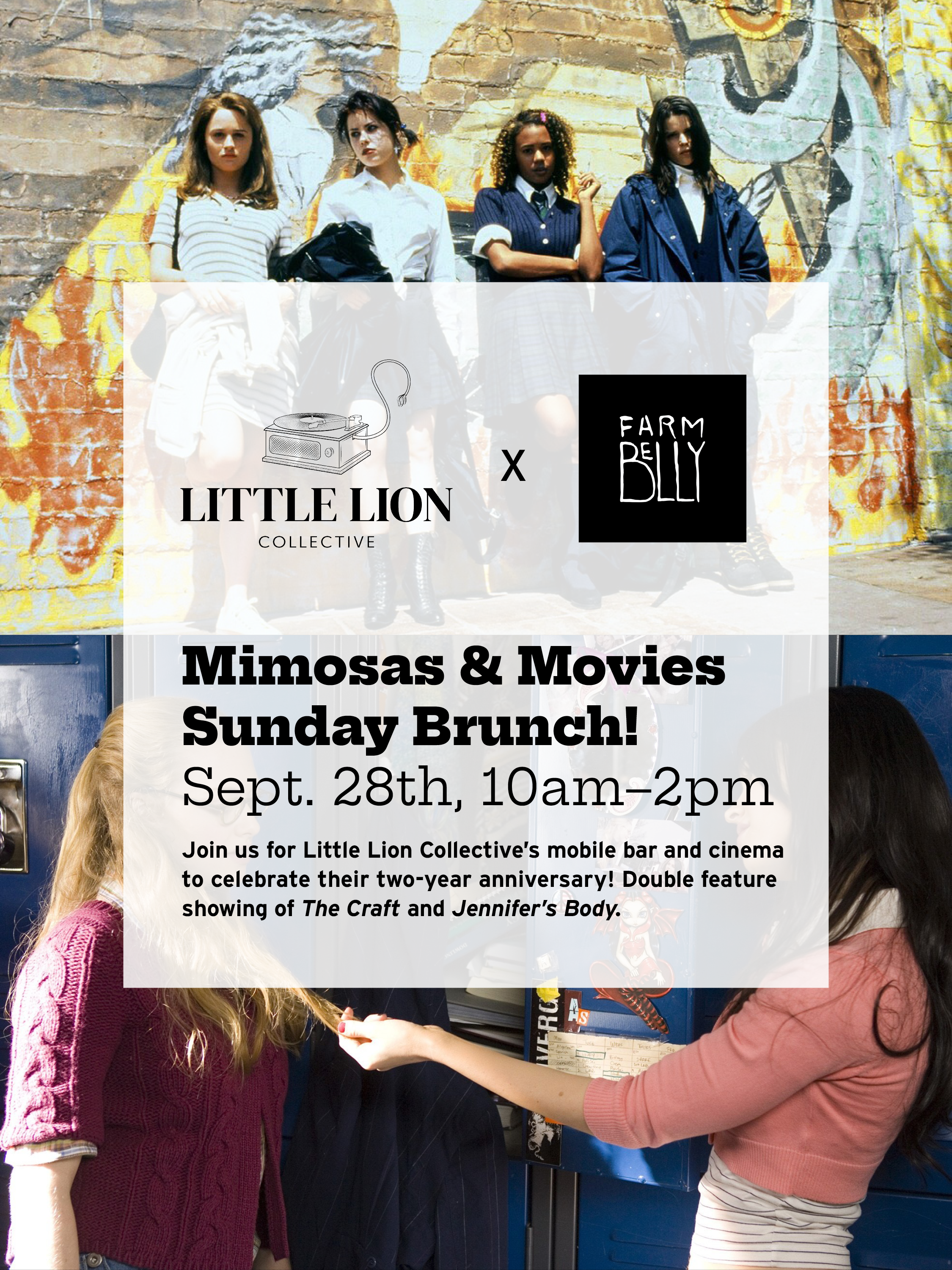 Join us for Little Lion Collective's mobile bar and cinema to celebrate our two-year anniversary! Double feature showing of The Craft and Jennifer's Body with mimosas and farm-fresh bloody Marys. 10am-2pm at The Farm Belly! Tickets are free with an option to donate. :)